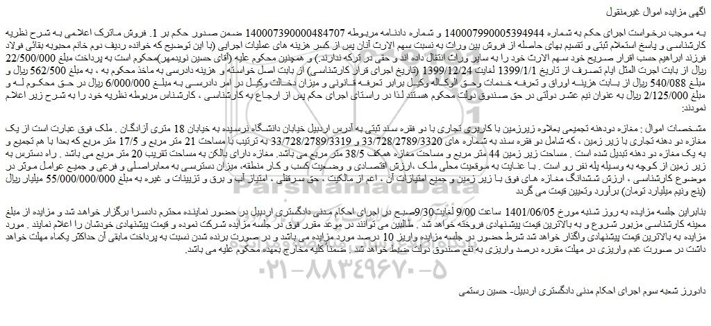 بنابراین جلسه مزایده به روز شنبه مورخ 1401/06/05 ساعت 9/00 لغایت9/30صبح در اجرای احکام مدنی دادگستری اردبیل در حضور نماینده محترم دادسرا برگزار خواهد شد و مزایده از مبلغ معینه کارشناسی مزبور شروع و به بالاترین قیمت پیشنهادی فروخته خواهد شد . طالبین می توانند در موعد مقرر فوق در جلسه مزایده شرکت نموده و قیمت پیشنهادی خودشان را اعلام نمایند . مورد مزایده به بالاترین قیمت پیشنهادی واگذار خواهد شد شرط حضور در جلسه مزایده واریز 10 درصد مورد مزایده می باشد و در صورت برنده شدن نسبت به پرداخت مابقی آن حداکثر یکماه مهلت خواهد داشت در صورت عدم واریزی در مهلت مقرره درصد واریزی به نفع صندوق دولت ضبط خواهد شد . ضمناً کلیه مخارج بعهده محکوم علیه می باشد.