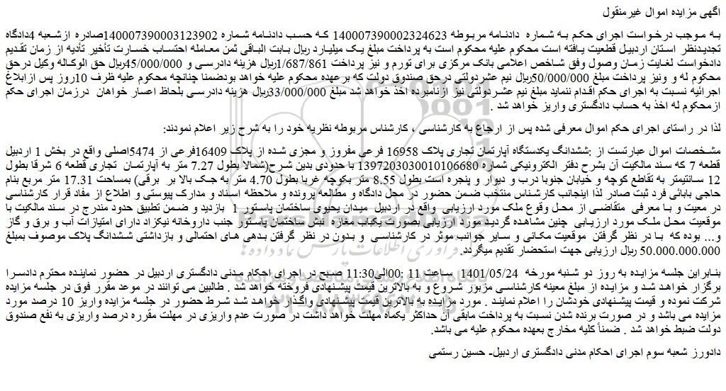 به موجب درخواست اجرای حکم به شماره  دادنامه مربوطه 140007390002324623 که حسب دادنامه شماره 140007390003123902صادره ازشعبه 4دادگاه تجدیدنظر استان اردبیل قطعیت یافته است محکوم علیه محکوم است به پرداخت مبلغ یک میلیارد ریال بابت الباقی ثمن معامله احتساب خسارت تأخیر تأدیه از زمان تقدیم دادخواست لغایت زمان وصول وفق شاخص اعلامی بانک مرکزی برای تورم و نیز پرداخت 1/687/861ریال هزینه دادرسی و 45/000/000ریال حق الوکاله وکیل درحق محکوم له و ونیز پرداخت مبلغ 50/000/000ریال نیم عشردولتی درحق صندوق دولت که برعهده محکوم علیه خواهد بودضمنا چنانچه محکوم علیه ظرف 10روز پس ازابلاغ اجرائیه نسبت به اجرای حکم اقدام ننماید مبلغ نیم عشردولتی نیز ازنامبرده اخذ خواهد شد مبلغ 33/000/000ریال هزینه دادرسی بلحاظ اعسار خواهان  درزمان اجرای حکم ازمحکوم له اخذ به حساب دادگستری واریز خواهد شد .