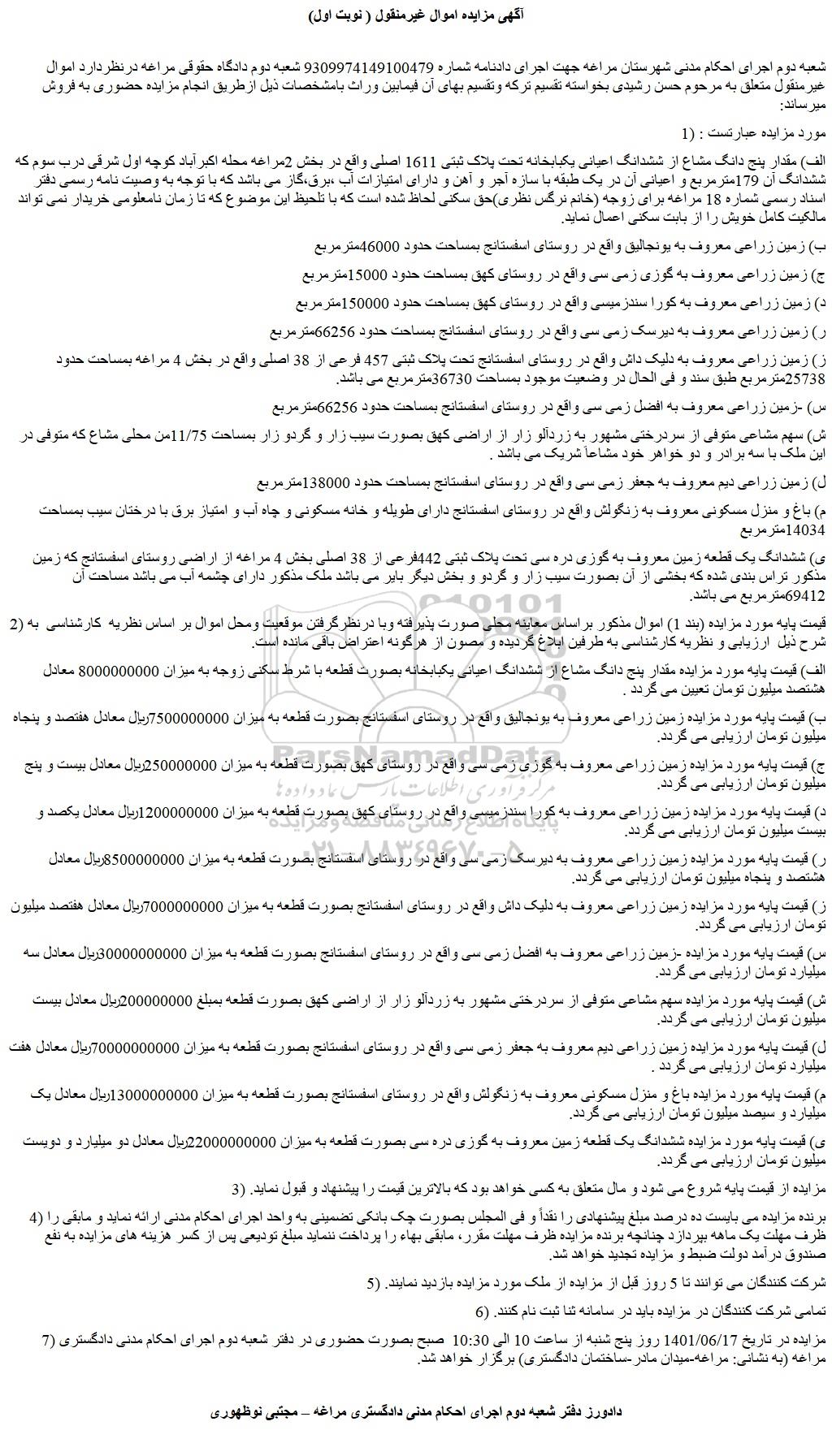 شعبه دوم اجرای احکام مدنی شهرستان مراغه جهت اجرای دادنامه شماره 9309974149100479 شعبه دوم دادگاه حقوقی مراغه درنظردارد اموال غیرمنقول متعلق به مرحوم حسن رشیدی بخواسته تقسیم ترکه وتقسیم بهای آن فیمابین وراث بامشخصات ذیل ازطریق انجام مزایده حضوری به فروش میرساند: