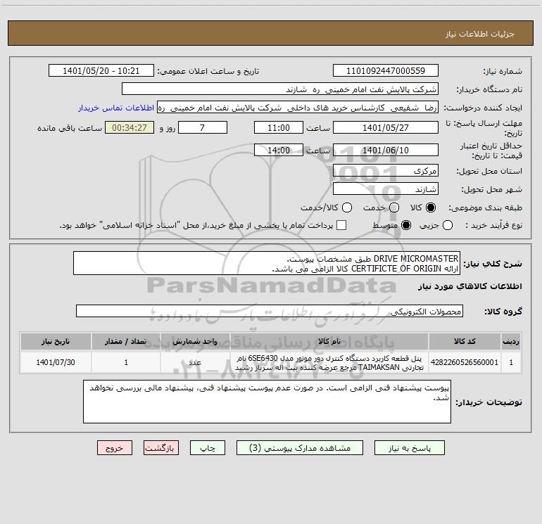 استعلام DRIVE MICROMASTER طبق مشخصات پیوست. ارائه CERTIFICTE OF ORIGIN کالا الزامی می باشد., استعلام DRIVE MICROMASTER طبق مشخصات پیوست. ارائه CERTIFICTE OF ORIGIN کالا الزامی می باشد.