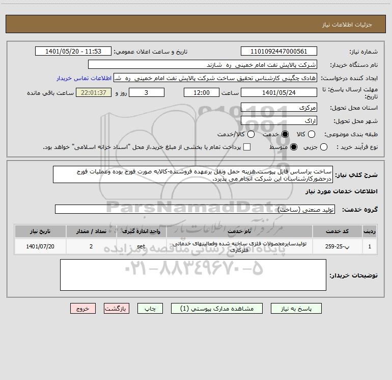 شرح کلی نیاز: ساخت براساس فایل پیوست.هزینه حمل ونقل برعهده فروشنده-کالابه صورت فورج بوده وعملیات فورج درحضورکارشناسان این شرکت انجام می پذیرد.
