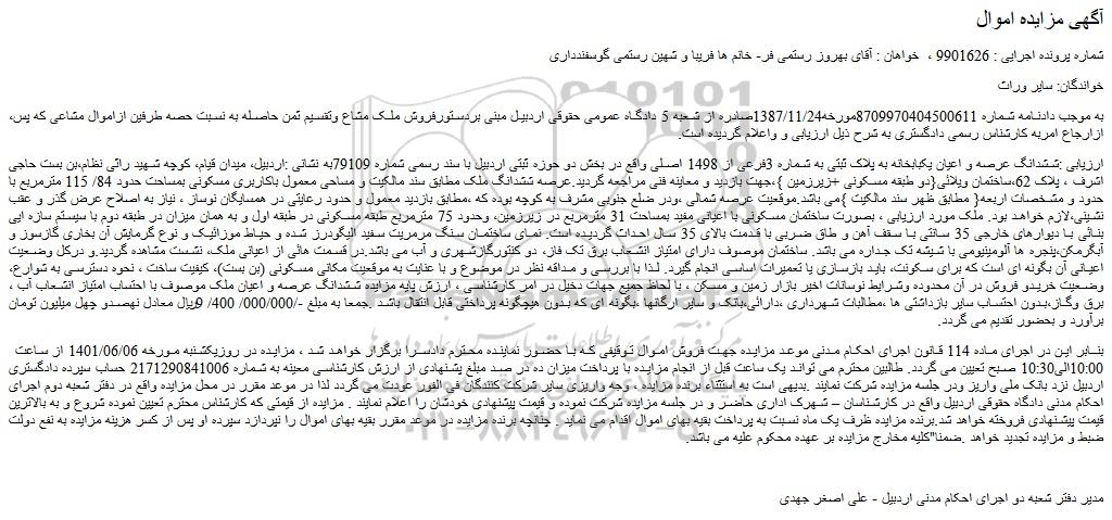 ،به موجب دادنامه شماره 8709970404500611مورخه1387/11/24صادره از شعبه 5 دادگاه عمومی حقوقی اردبیل مبنی بردستورفروش ملک مشاع وتقسیم ثمن حاصله به نسبت حصه طرفین ازاموال مشاعی که پس ازارجاع امربه کارشناس رسمی دادگستری به شرح ذیل ارزیابی و واعلام گردیده است.