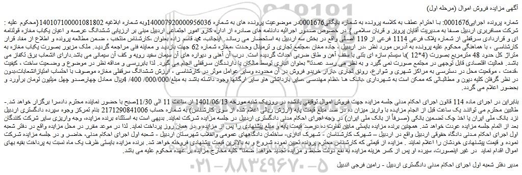-بنابراین در اجرای ماده 114 قانون اجرای احکام مدنی جلسه مزایده جهت فروش اموال توقیفی یادشده در روزیک شنبه مورخه 1401/06/13 از ساعت 11 الی 11/30صبح با حضور نماینده محترم دادسرا برگزار خواهد شد. طالبین محترم می توانند یک ساعت قبل از انجام مزایده با واریز میزان ده در صد مبلغ قیمت پایه (ارزش ریالی اعلام شده از سوی کارشناس) به شماره حساب 2171290841006 بنام تمرکز وجوه سپرده دادگستری اردبیل نزد بانک ملی ایران یا اخذ چک تضمین بانکی (صرفاً از بانک ملی ایران) در وجه اجرای احکام مدنی دادگستری اردبیل در جلسه مزایده شرکت نمایند. بدیهی است به استثناء برنده مزایده، وجه واریزی سایر شرکت کنندگان بعد از اتمام جلسه مزایده عودت خواهد شد. همچنین برنده مزایده بایستی مابین تفاوت ده درصد قیمت پایه و مبلغ پیشنهادی را پس از مزایده و در همان روز پرداخت نماید. لذا در موعد مقرر در محل مزایده واقع در دفتر شعبه اول اجرای احکام مدنی دادگاه حقوقی اردبیل واقع در اردبیل – شهرک کارشناسان - شهرک اداری- ساختمان دادگاههای عمومی وانقلاب شهرستان اردبیل - شعبه اول اجرای احکام مدنی، حاضر و در جلسه مزایده شرکت نموده و قیمت پیشنهادی خودشان را اعلام نمایند . مزایده از قیمتی که کارشناس محترم پرونده تعیین نموده شروع و به بالاترین قیمت پیشنهادی فروخته خواهد شد. برنده مزایده بایستی ظرف یک ماه نسبت به پرداخت بقیه بهای اموال اقدام نماید در غیر اینصورت، سپرده او پس از کسر هزینه مزایده به نفع دولت ضبط و مزایده تجدید خواهد. ضمنا" کلیه مخارج مزایده بر عهده محکوم علیه می باشد.