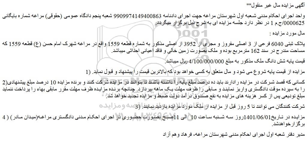واحد اجرای احکام مدنی شعبه اول شهرستان مراغه جهت اجرای دادنامه 9909974149400863 شعبه پنجم دادگاه عمومی (حقوقی) مراغه شماره بایگانی 0000625/ج.م 1 در نظر دارد جلسه مزایده ای به شرح ذیل برگزار میگردد.