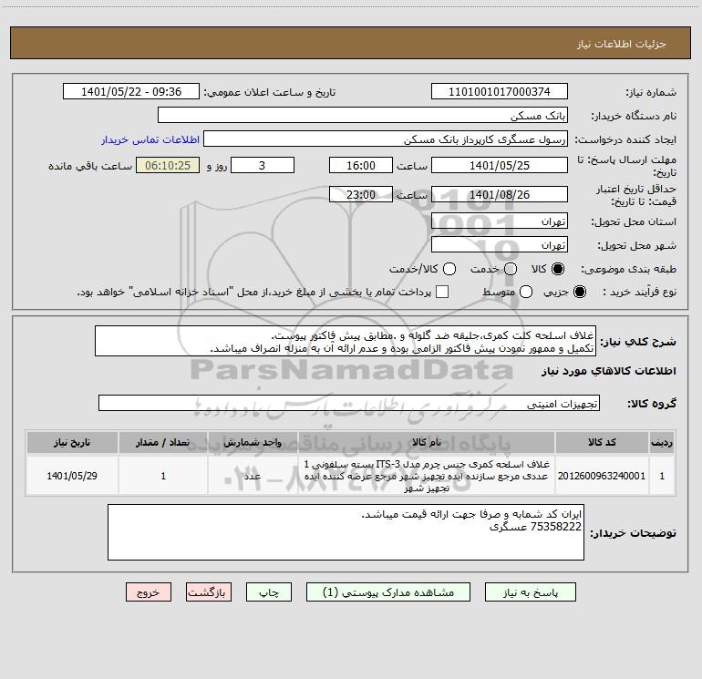 شرح کلی نیاز: غلاف اسلحه کلت کمری،جلیقه ضد گلوله و .مطابق پیش فاکتور پیوست. تکمیل و ممهور نمودن پیش فاکتور الزامی بوده و عدم ارائه آن به منزله انصراف میباشد.