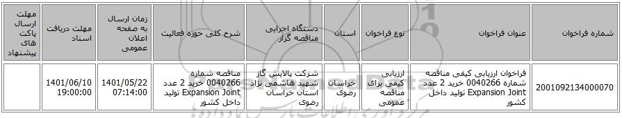 | 2001092134000070 | فراخوان ارزیابی کیفی مناقصه شماره 0040266 خرید 2 عدد Expansion Joint تولید داخل کشور | ارزیابی کیفی برای مناقصه عمومی | خراسان رضوی | شرکت پالایش گاز شهید هاشمی نژاد استان خراسان رضوی | مناقصه شماره 0040266 خرید 2 عدد Expansion Joint تولید داخل کشور | 1401/05/22 07:14:00 | 1401/06/10 19:00:00 |