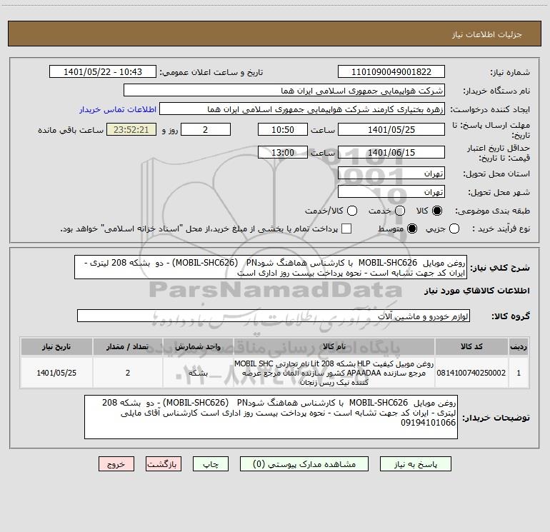 شرح کلی نیاز: روغن موبایل MOBIL-SHC626 با کارشناس هماهنگ شودMOBIL-SHC626) PN) - دو بشکه 208 لیتری - ایران کد جهت تشابه است - نحوه پرداخت بیست روز اداری است