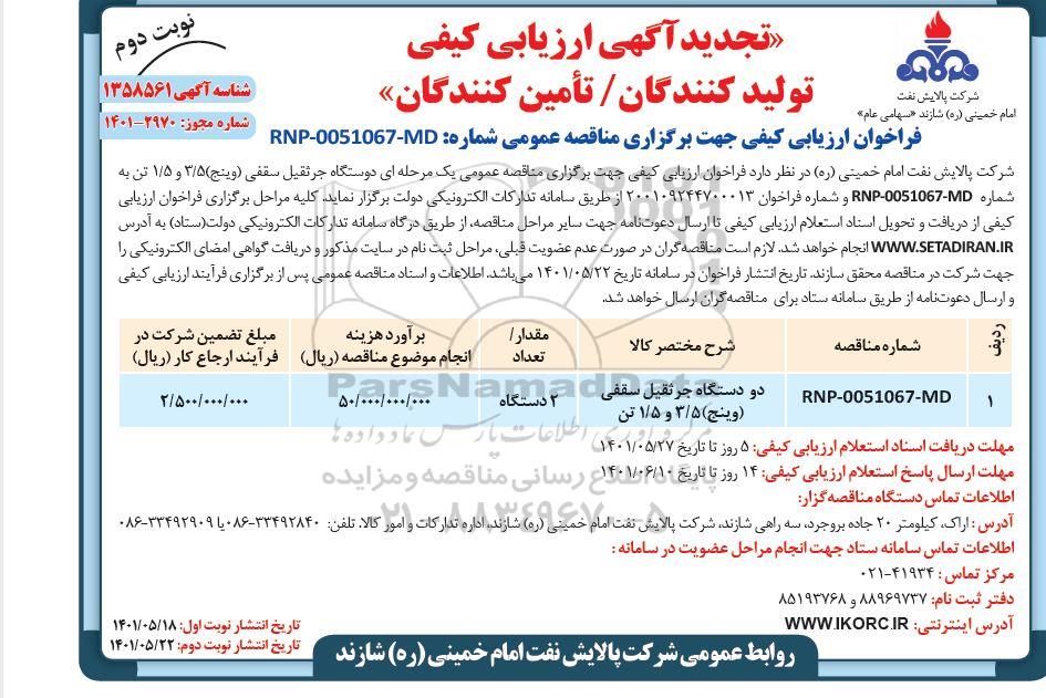 شرکت پالایش نفت امام خمینی (ره) در نظر دارد فراخوان ارزیابی کیفی جهت برگزاری مناقصه عمومی یک مرحله ای دو دستگاه جرثقیل سقفی (وینج ) 3.5 و 1.5 تن به شماره RNp-0051067-Md شماره فراخوان 200109244700013 را از طریق سامانه تدارکات الکترونیکی دولت برگزار کند. کلیه مراحل برگزاری فراخوان ارزیابی کیفی از دریافت و تحویل اسناد استعلام ارزیابی کیفی تا ارسال دعوت نامه جهت سایر مراحل مناقصه از طریق درگاه سامانه تدارکات الکترونیکی دولت ستاد به آدرس ستاد ایران انجام خواهد شد لازم است مناقصه گران در صورت عدم عضویت قبلی مراحل ثبت نام در سایت مذکور و دریافت گواهی امضای الکترونیکی ار جهت شرکت در مناقصه محقق سازند. تاریخ انتشار فراخوان در سامانه تاریخ 1401.5.22 می باشد. اطلاعات و اسناد مناقصه عمومی پس از برگزاری فرآیند ارزیابی کیفی و ارسال دعوتنامه از طریق سامانه ستاد برای مناقصه گران ارسال خواهد شد.