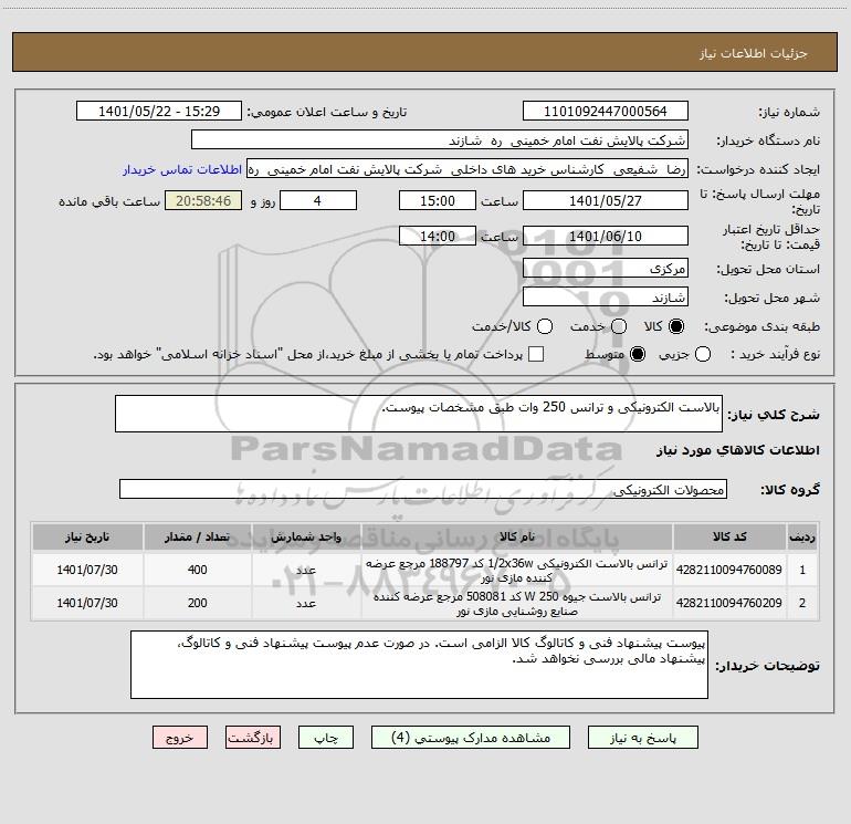 استعلام بالاست الکترونیکی و ترانس 250 وات طبق مشخصات پیوست., استعلام بالاست الکترونیکی و ترانس 250 وات طبق مشخصات پیوست.