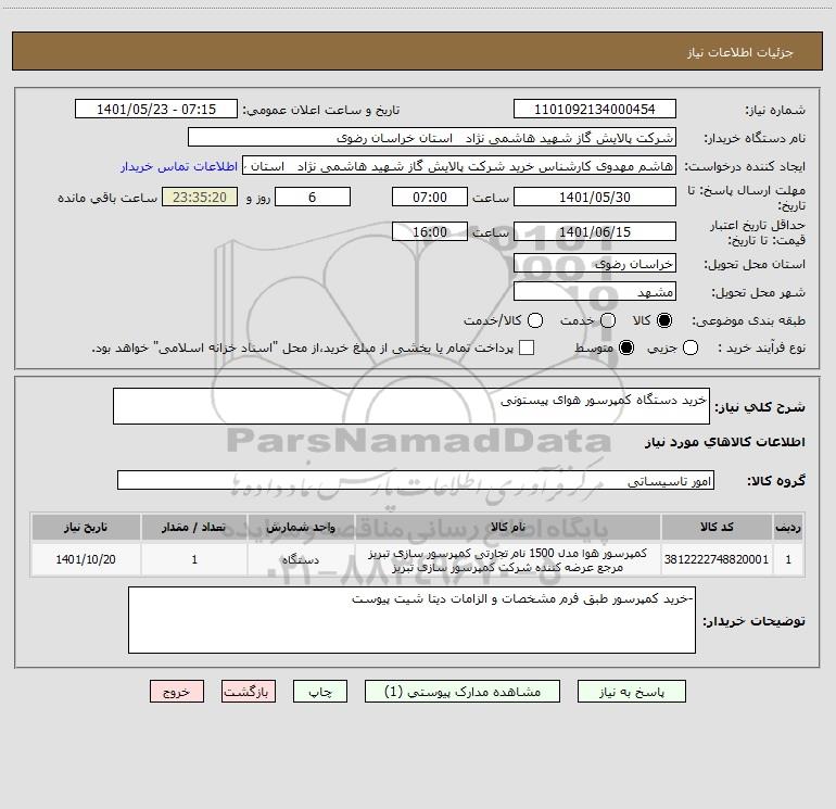 نام دستگاه خریدار:شرکت پالایش گاز شهید هاشمی نژاد استان خراسان رضوی