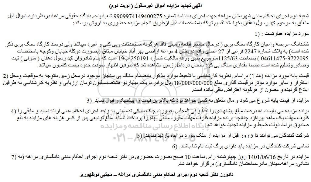 شعبه دوم اجرای احکام مدنی شهرستان مراغه جهت اجرای دادنامه شماره 9909974149400275 شعبه پنجم دادگاه حقوقی مراغه درنظردارد اموال ذیل متعلق به مرحوم محمد رسول دهقان بخواسته تقسیم ترکه بامشخصات ذیل ازطریق انجام مزایده حضوری به فروش برساند: