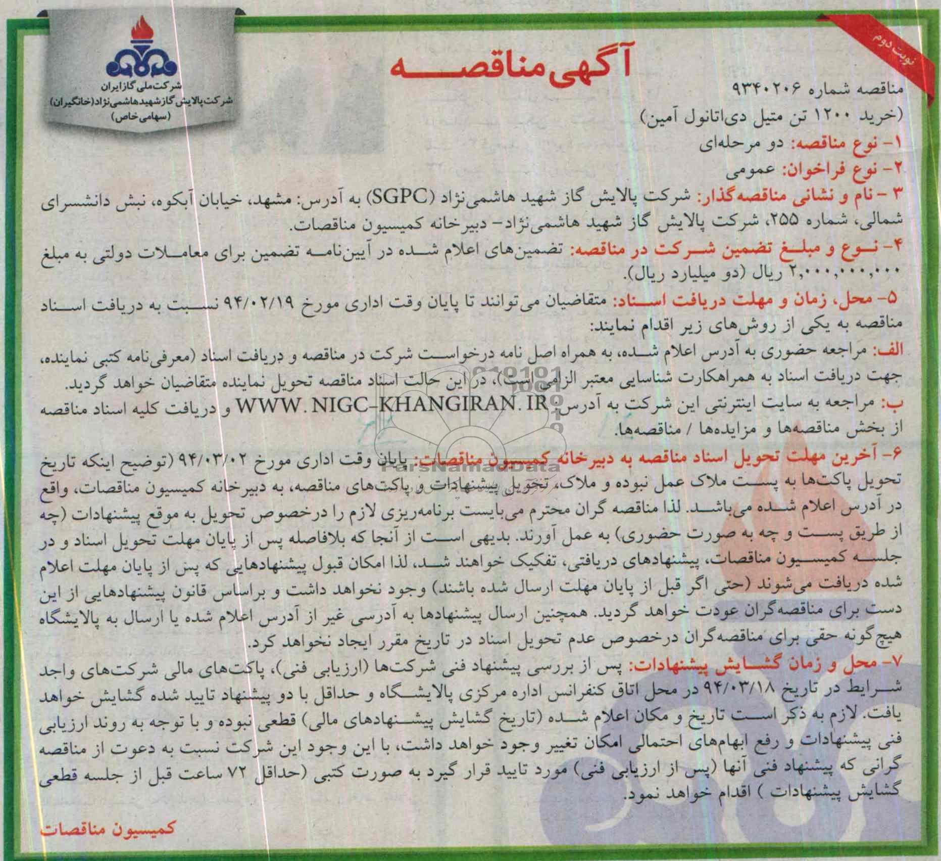 نام و نشانی مناقصه گزار: شرکت پالایش گاز شهید هاشمی نژاد (SGPC) به آدرس: مشهد، خیابان آّبکوه، نبش دانشسرای شمالی، شماره 255، شرکت پالایش گاز شهید هاشمی نژاد، دبیرخانه کمیسیون مناقصات