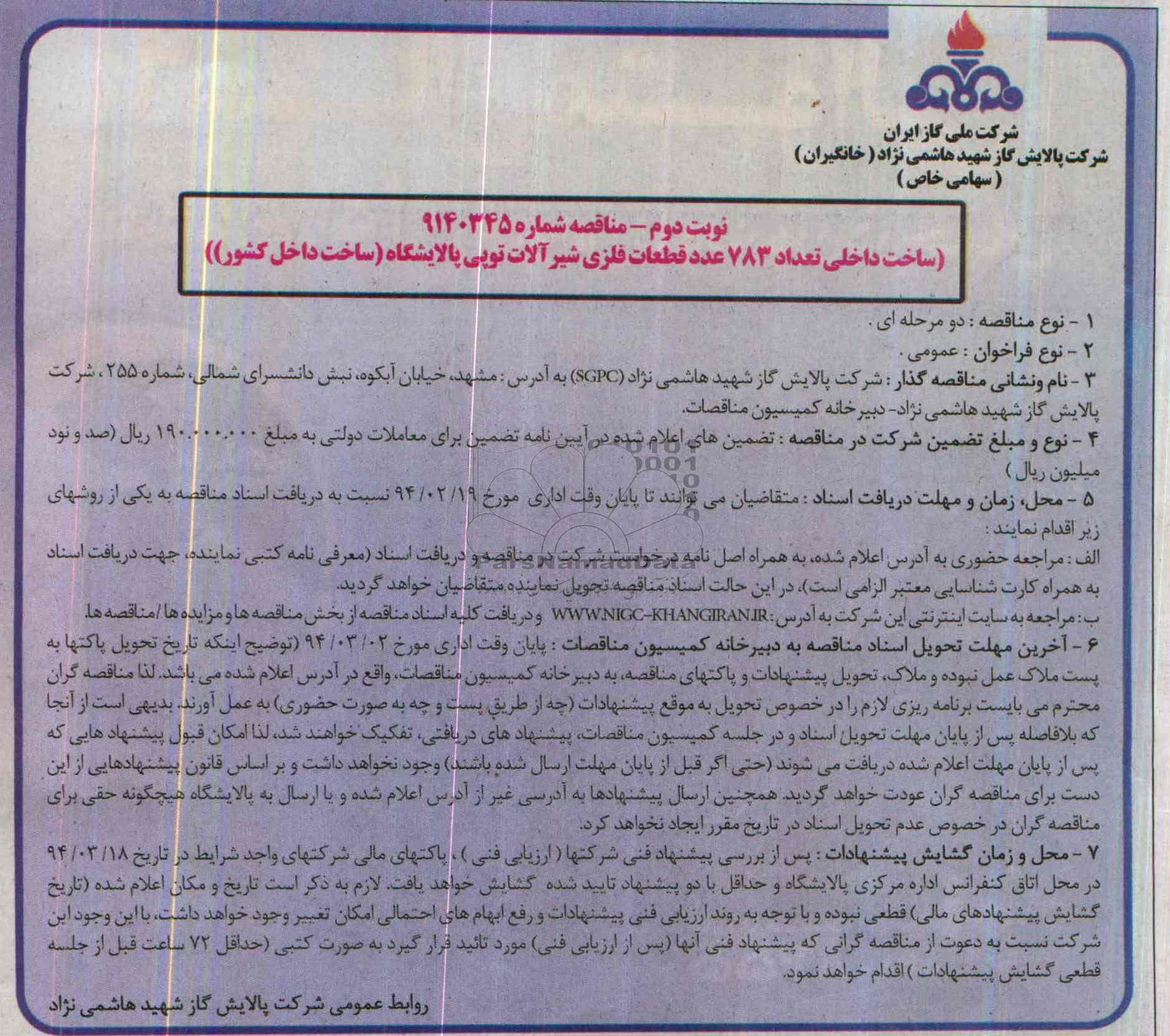 آخرین مهلت تحویل اسناد مناقصه به دبیرخانه کمیسیون مناقصات: پایان وقت اداری مورخ 94.03.02 (توضیح اینکه تاریخ تحویل پاکت ها پست ملاک عمل نبوده و ملاک تحویل پیشنهادات و پاکت های مناقصه به دبیرخانه کمیسیون مناقصات واقع در آدرس اعلام شده می باشد. لذا مناقصه گران محترم می بایست برنامه ریزی لازم را در خصوص تحویل به موقع پیشنهادات چه از طریق پست و چه به صورت حضوری به عمل آورند. بدیهی است از آنجا که بلافاصله پس از پایان مهلت تحویل اسناد و در جلسه کمیسیون مناقصات، پیشنهادهای دریافتی تفکیک خواهند شد، لذا امکان قبول پیشنهادهایی که پس از پایان مهلت اعلام شده دریافت می شوند (حتی اگر قبل از پایان مهلت ارسال شده با شند) وجود نخواهد داشت و براساس قانون پیشنهادهایی از این دست برای مناقصه گران عودت خواهد گردید. همچنین ارسال پیشنهادها به آدرسی غیر از آدرس اعلام شده و یا ارسال به پالایشگاه هیچگونه حقی برای مناقصه گران در خصوص عدم تحویل اسناد در تاریخ مقرر ایجاد نخواهد کرد.