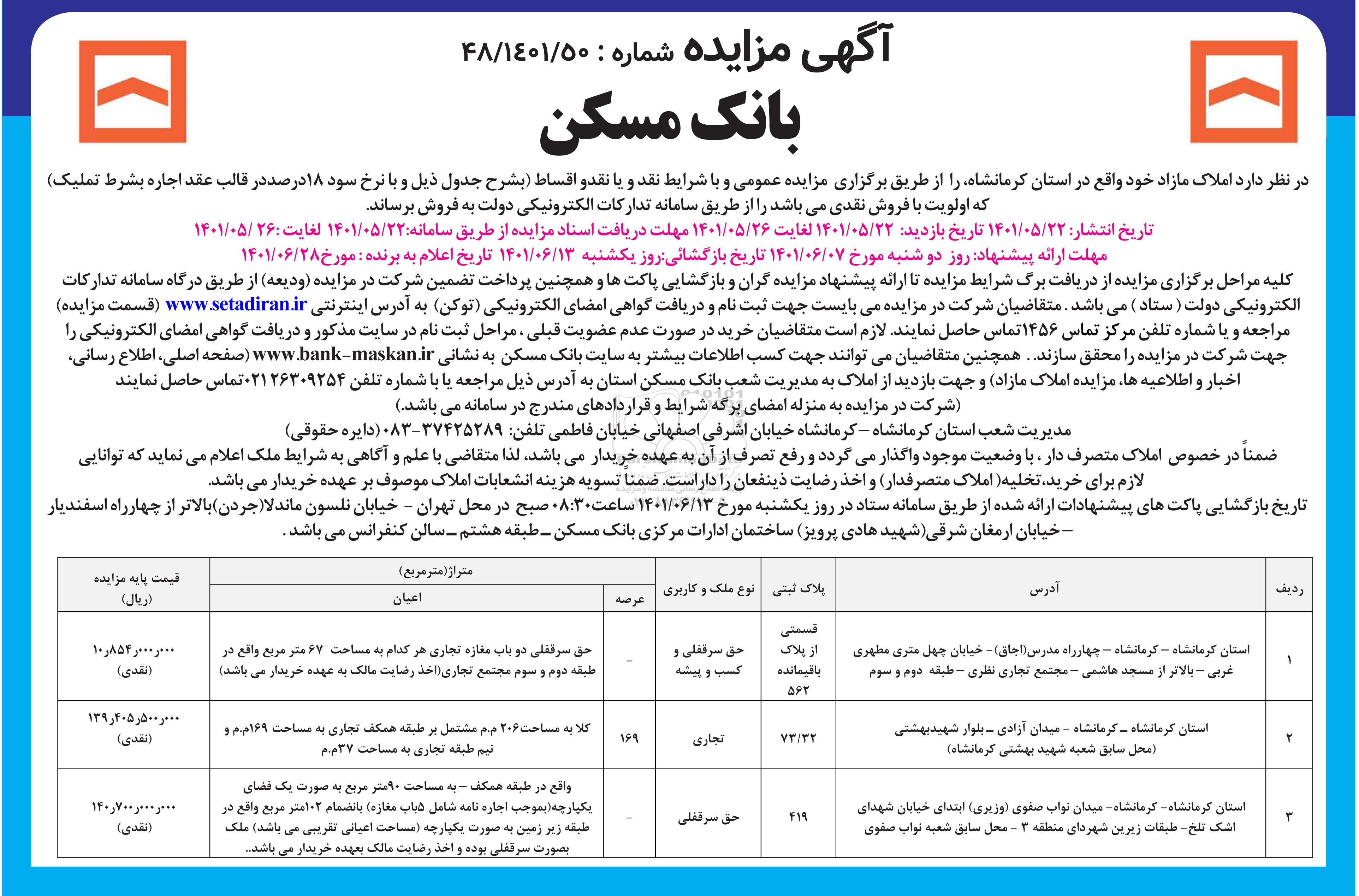 بانک مسکن در نظر دارد املاک مازاد خود واقع در استان کرمانشاه را از طریق برگزاری مزایده عمومی به فروش برساند