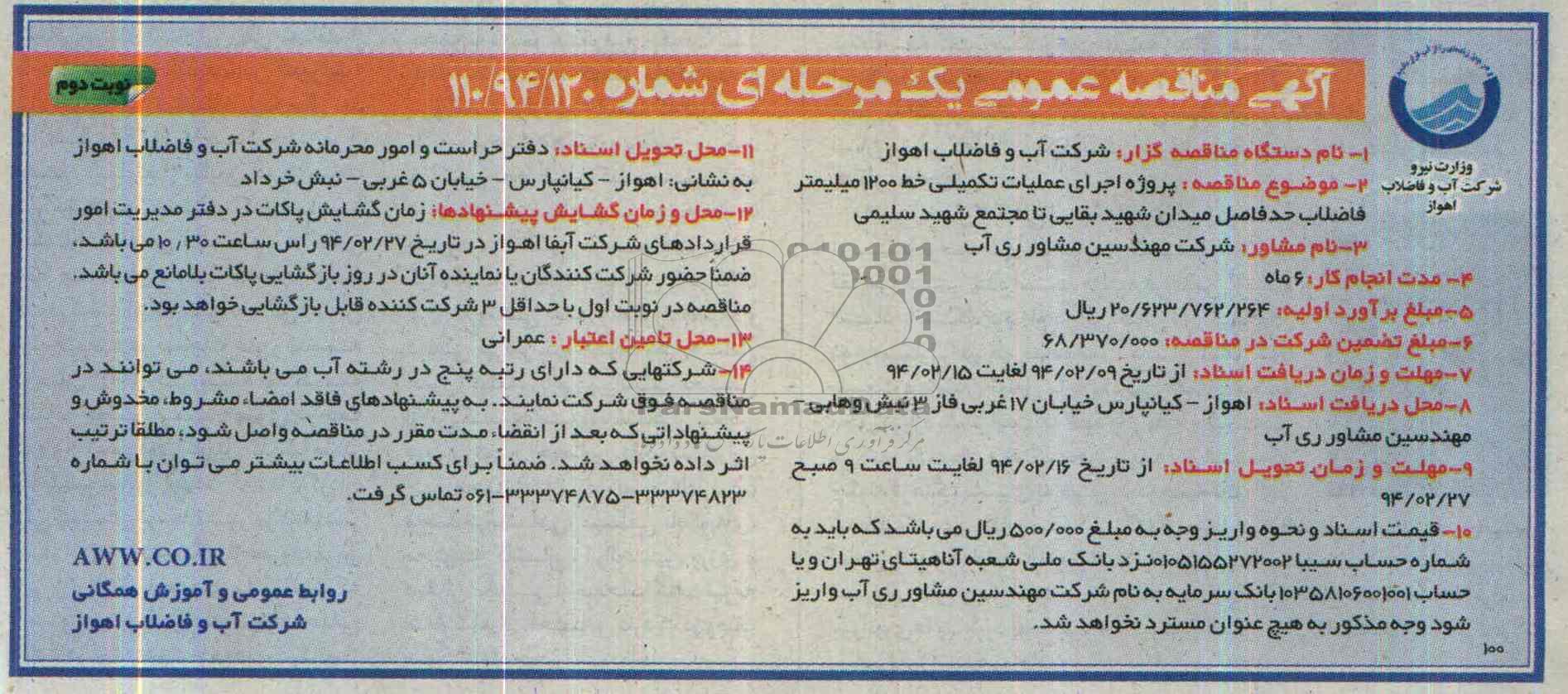 12- محل و زمان گشایش پیشنهادها : زمان گشایش پاکات در دفتر مدیریت امور قراردادهای شرکت آبفا اهواز در تاریخ 94.2.27 راس ساعت 10:30 می باشد.