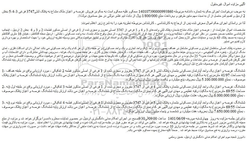 به موجب درخواست اجرای حکم به شماره دادنامه مربوطه 140107390000993860 محکوم علیه محکوم است به حکم بر فروش عرصه و اعیان ملک مشاع به پلاک ثبتی3747 فرعی 3-4-5 بخش 2 اردبیل و تقسیم ثمن حاصل از آن به نسبت سهم مابین طرفین و پرداخت مبلغ 1/800/000 ریال از بابت نیم عشر دولتی در حق صندوق دولت//.