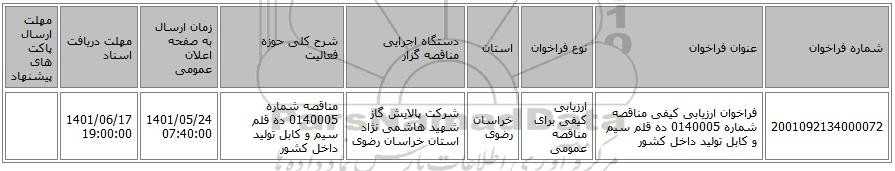 مناقصه، فراخوان ارزیابی کیفی مناقصه شماره 0140005 ده قلم سیم و کابل تولید داخل کشور, مناقصه، فراخوان ارزیابی کیفی مناقصه شماره 0140005 ده قلم سیم و کابل تولید داخل کشور