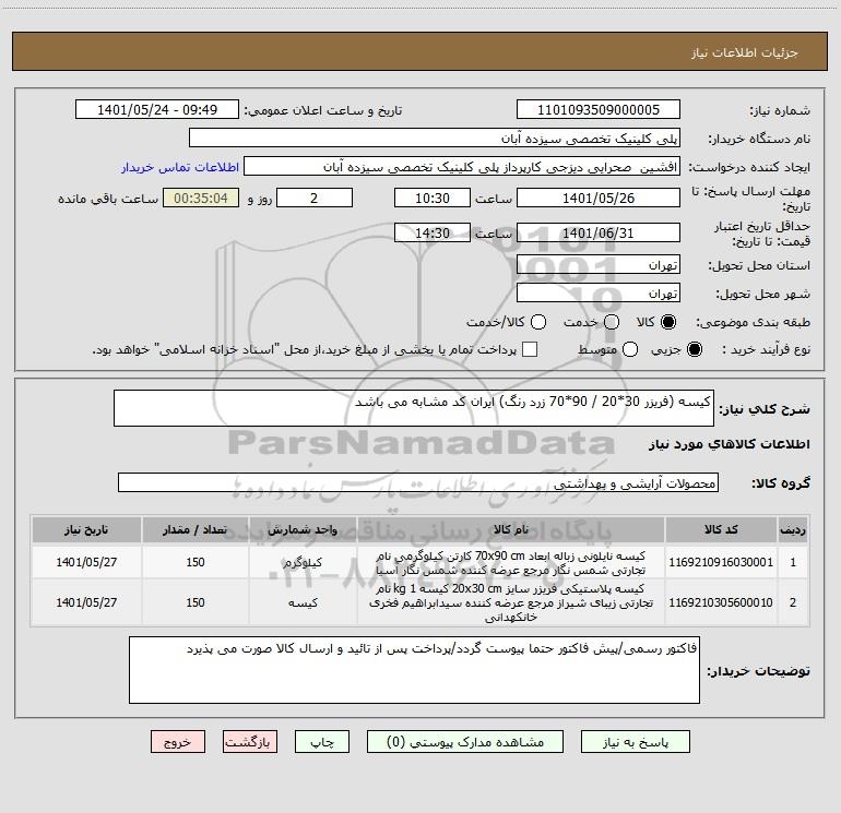 شرح کلی نیاز: کیسه (فریزر 30*20 / 90*70 زرد رنگ) ایران کد مشابه می باشد
