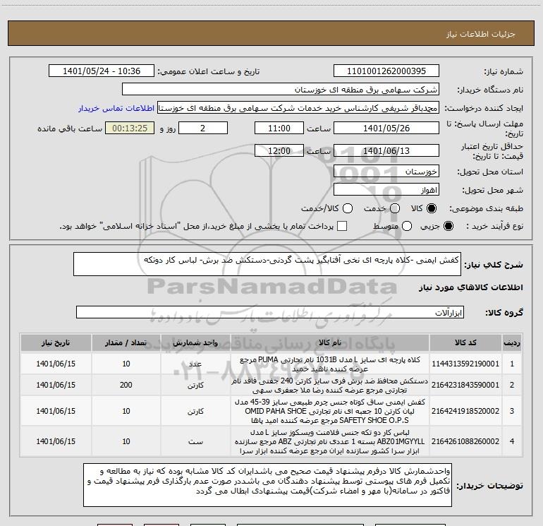 شرح کلی نیاز: کفش ایمنی -کلاه پارچه ای نخی آفتابگیر پشت گردنی-دستکش ضد برش- لباس کار دوتکه