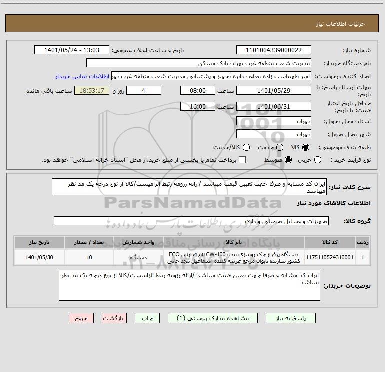 شرح کلی نیاز: ایران کد مشابه و صرفا جهت تعیین قیمت میباشد /ارائه رزومه رتبط الزامیست/کالا از نوع درجه یک مد نظر میباشد