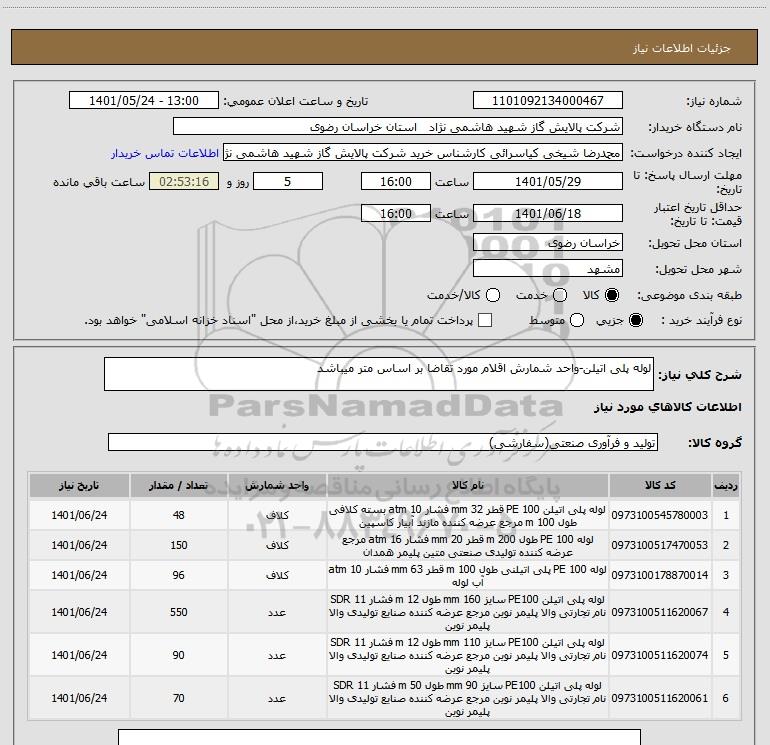 نام دستگاه خریدار:شرکت پالایش گاز شهید هاشمی نژاد استان خراسان رضوی