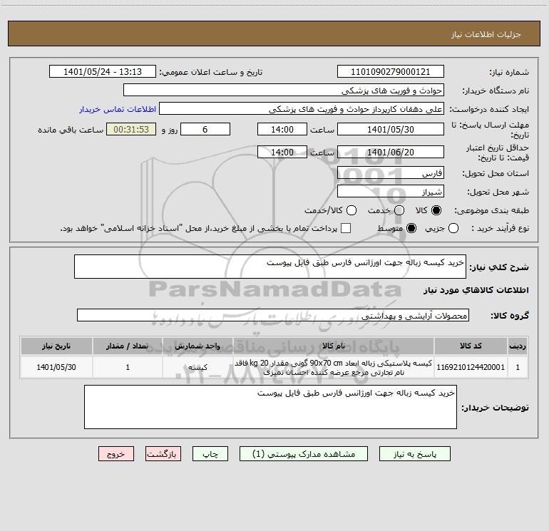 شرح کلی نیاز: خرید کیسه زباله جهت اورژانس فارس طبق فایل پیوست