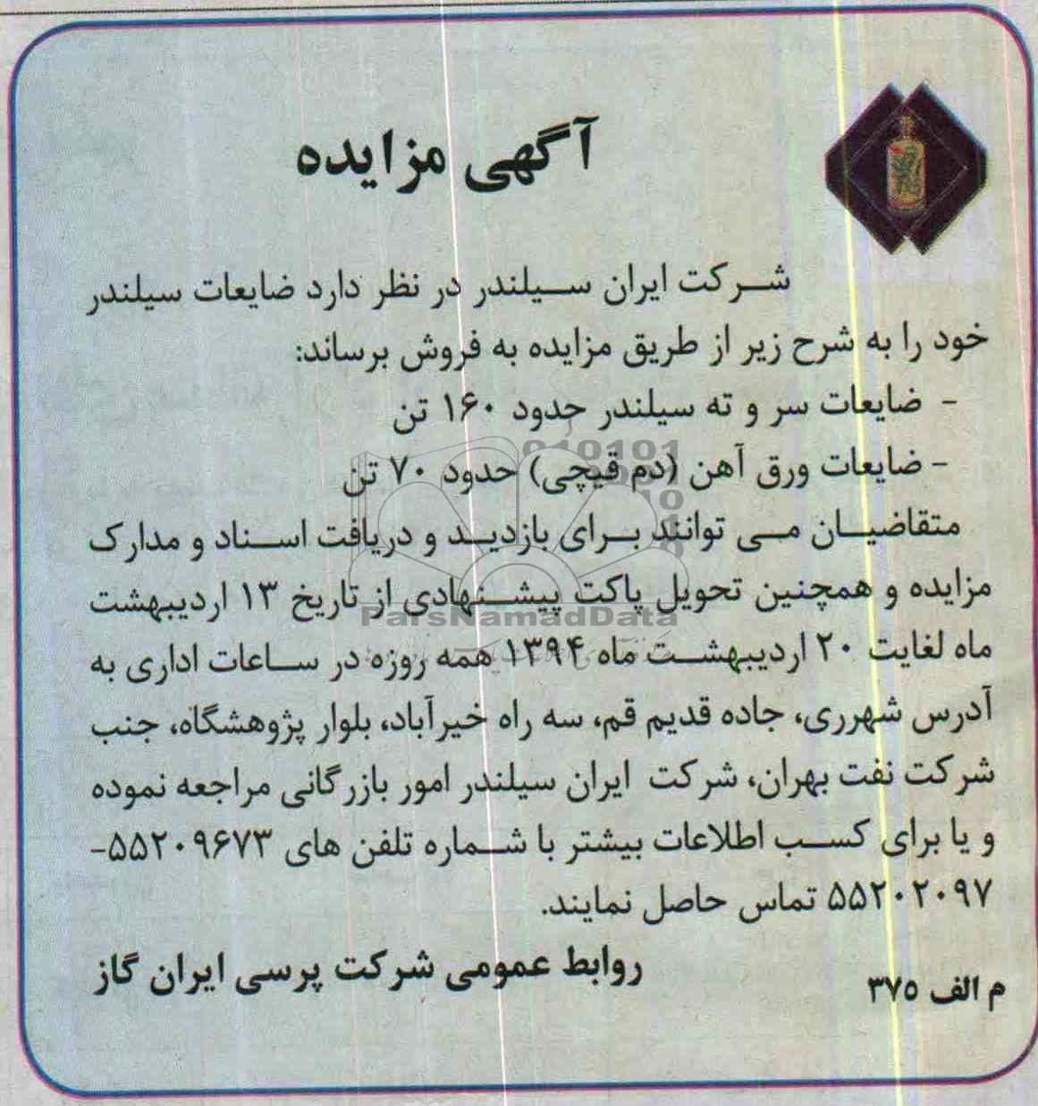 شرکت ایران سیلندر در نظر دارد ضایعات سیلندر خود را به شرح زیر از طریق مزایده به فروش برساند :