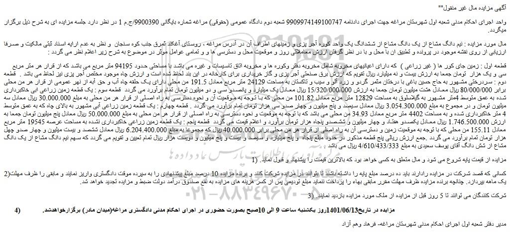 قطعه اول : زمین جای کور ها ( غیر زراعی ) که دارای اعیانیهای مخروبه شامل مخروبه دفتر وکوره ها و مخروبه اتاق تاسیسات و غیره می باشد با مساحتی حدود 94195 متر مربع می باشد که از قرار هر متر مربع سی و یک هزار تومان جمعا به ارزش بیست و نه میلیارد ریال تقویم که ارزش برق صنعتی آجر پزی و گاز خریداری برای کارخانه در این بند لحاظ شده است و ارزش چاه موجود مختص آجر پزی نیز لحاظ می باشد . قطعه دوم : سردرختی مشهور به حاج حسین باغی با درختان مثمر گردو و زرد آلو و سیب و تاکستان به مساحت 24129 متر مربع معادل 191.5 من محلی دارای یک حلقه چاه آب و حق آبه از نهر عمومی از قرار هر من محلی برابر 80/000/000 ریال معادل هشت میلیون تومان جمعا به ارزش 15/320/000/000 ریال معادل یک میلیارد و پانصدو سی و دو میلیون تومان تمام برآورد می گردد قطعه سوم : یک قطعه زمین زراعی ابی خاکبرداری شده به عمق متوسط 4متر مشهور به گیلاسلوق به مساحت 12829 متر مربع معادل 101.82 من محلی که با توجه به موقعیت آن و نحوه دسترسی به راه اصلی از قرار هر من محلی به مبلغ 30.000.000 ریال معادل سه میلیون تومان و در مجموع به مبلغ 3.054.300.000 ریال معادل سیصد و پنج میلیون و چهار صدو سی هزار تومان تمام برآورد می گردد . قطعه چهارم : یک قطعه زمین زراعی آبی مشهور به بالای چاه که به عمق متوسط 4 متر خاکبرداری شده و به مساحت 4402 متر مربع معادل 34.93 من محلی می باشد که با توجه به موقعیت و نحوه دسترسی به راه اصلی از قرار هر من محلی به مبلغ 50.000.000 ریال معادل پنج میلیون تومان جمعا به ارزش 1.746.500.000 ریال معادل یکصدو هفتاد و چهار میلیون و ششصدو پنجاه هزار تومان برآورد و اعلام قیمت می گردد قطعه پنجم : یک قطعه زمین زراعی خاکبرداری نشده به مساحت عرصه 19545 متر مربع معادل 155.11 من محلی که با توجه به موقعیت زمین و دسترسی آن به راه اصلی از قرار هر من محلی برابر 40.000.000 ریال که مجموعا به مبلغ 6.204.400.000 ریال معادل ششصد و بیست میلیون و چهار صدو چهل هزار تومان تمام برآورد می گردد .جمع ارزش ریالی پنج قطعه مذکور در حدود مبلغ پنجاه و پنج میلیارد و سیصد و بیست و پنج میلیون و دویست هزار ریال تمام تعیین و تقویم می گردد که سهم نیم دانگ مشاع از یک دانگ مشاع از شش دانگ آقای یوسف سعیدی به مبلغ 4/610/433/333 ریال می باشد .