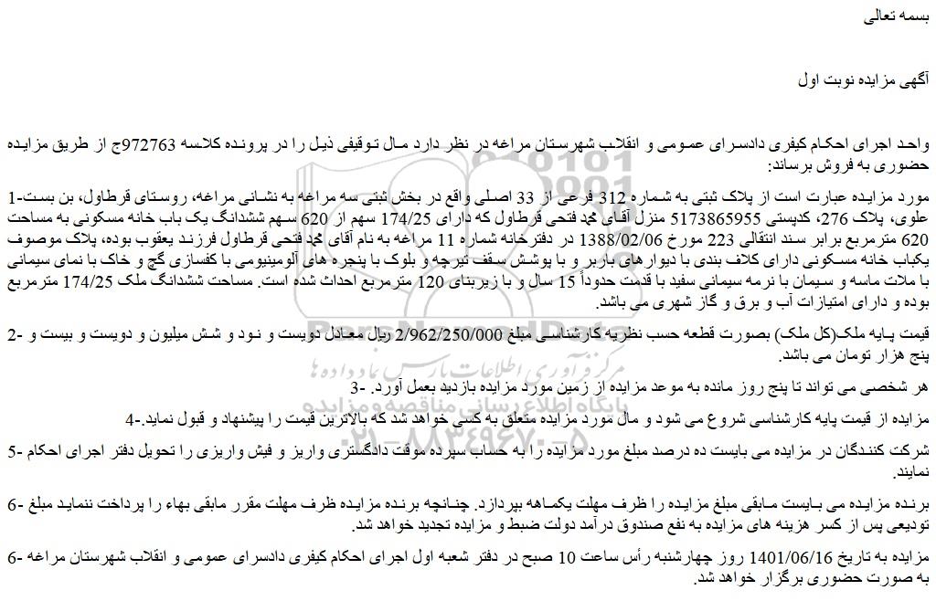 1-مورد مزایده عبارت است از پلاک ثبتی به شماره 312 فرعی از 33 اصلی واقع در بخش ثبتی سه مراغه به نشانی مراغه، روستای قرطاول، بن بست علوی، پلاک 276، کدپستی 5173865955 منزل آقای محمد فتحی قرطاول که دارای 174/25 سهم از 620 سهم ششدانگ یک باب خانه مسکونی به مساحت 620 مترمربع برابر سند انتقالی 223 مورخ 1388/02/06 در دفترخانه شماره 11 مراغه به نام آقای محمد فتحی قرطاول فرزند یعقوب بوده، پلاک موصوف یکباب خانه مسکونی دارای کلاف بندی با دیوارهای باربر و با پوشش سقف تیرچه و بلوک با پنجره های آلومینیومی با کفسازی گچ و خاک با نمای سیمانی با ملات ماسه و سیمان با نرمه سیمانی سفید با قدمت حدوداً 15 سال و با زیربنای 120 مترمربع احداث شده است. مساحت ششدانگ ملک 174/25 مترمربع بوده و دارای امتیازات آب و برق و گاز شهری می باشد.