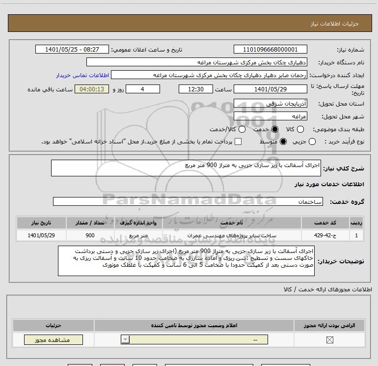 شرح کلی نیاز: اجرای آسفالت با زیر سازی جزیی به متراژ 900 متر مربع