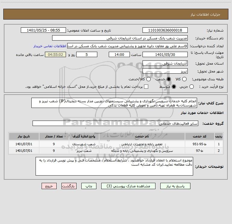 شرح کلی نیاز: انجام کلیه خدمات سرویس،نگهداری و پشتیبانی سیستمهای دوربین مدار بسته دیجیتال(IP) شعب تبریز و شهرستان،به همراه تهیه،تأمین و تعویض کلیه قطعات یدکی
