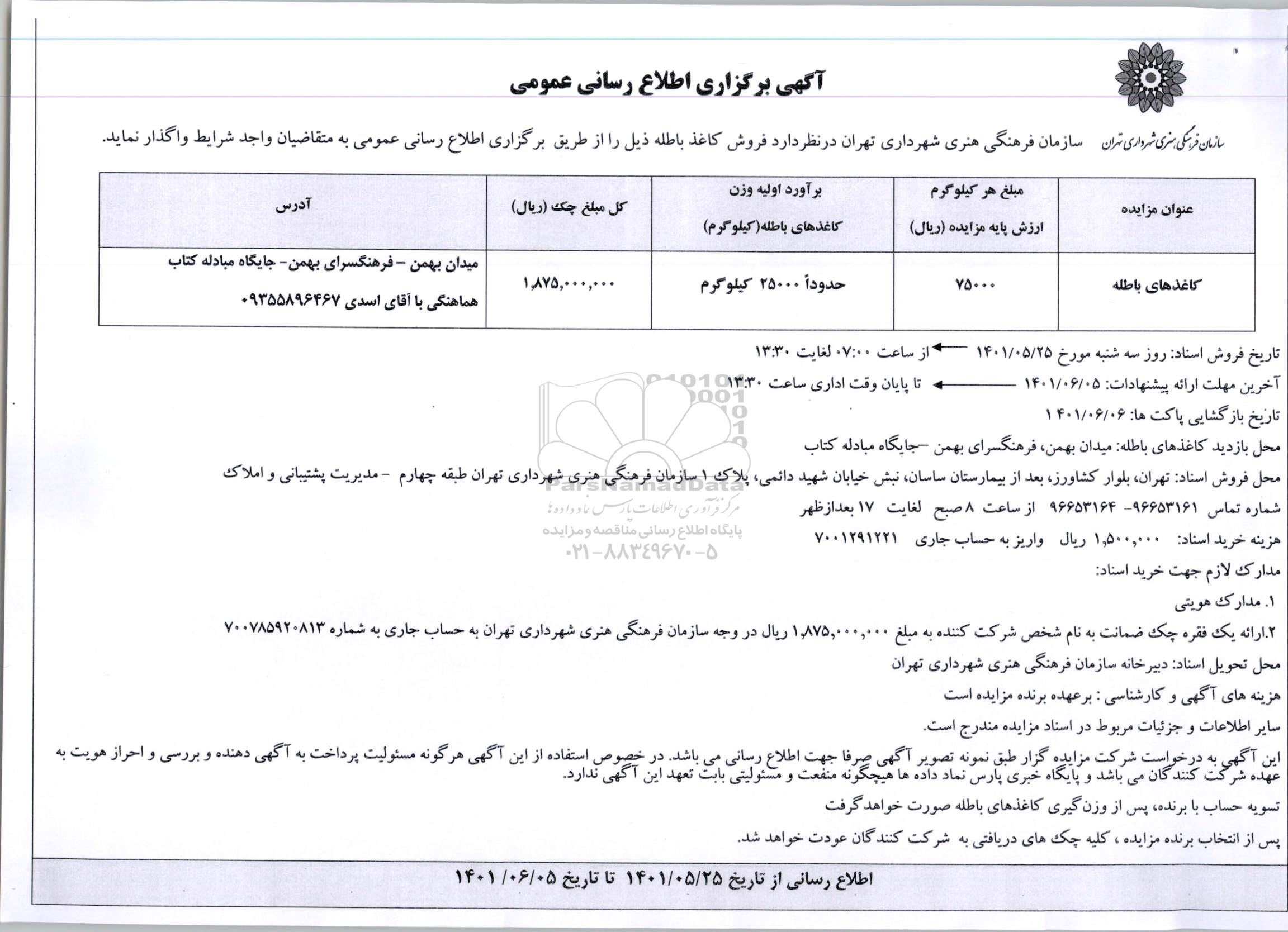 سازمان فرهنگی هنری شهرداری تهران در نظر دارد فروش کاغذ باطله ذیل را از طریق اطلاع رسانی عمومی به متقاضیان واجدشرایط واگذار نماید.