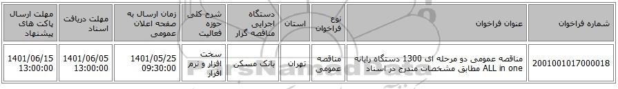 2001001017000018 | مناقصه عمومی دو مرحله ای 1300 دستگاه رایانه ALL in one مطابق مشخصات مندرج در اسناد | مناقصه عمومی | تهران | بانک مسکن | سخت افزار و نرم افزار | 1401/05/25 09:30:00 | 1401/06/05 13:00:00 | 1401/06/15 13:00:00 |