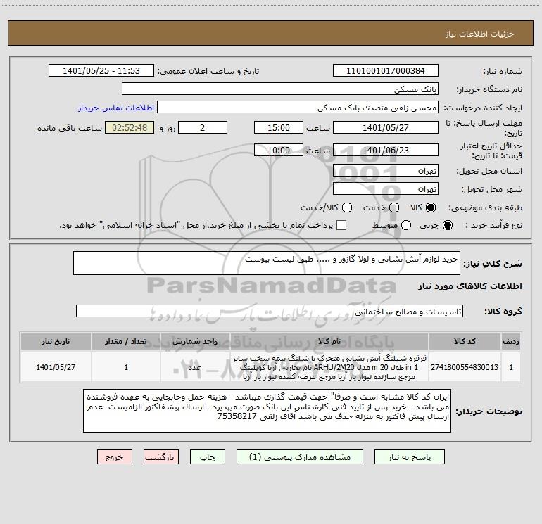 شرح کلی نیاز: خرید لوازم آتش نشانی و لولا گازور و ..... طبق لیست پیوست