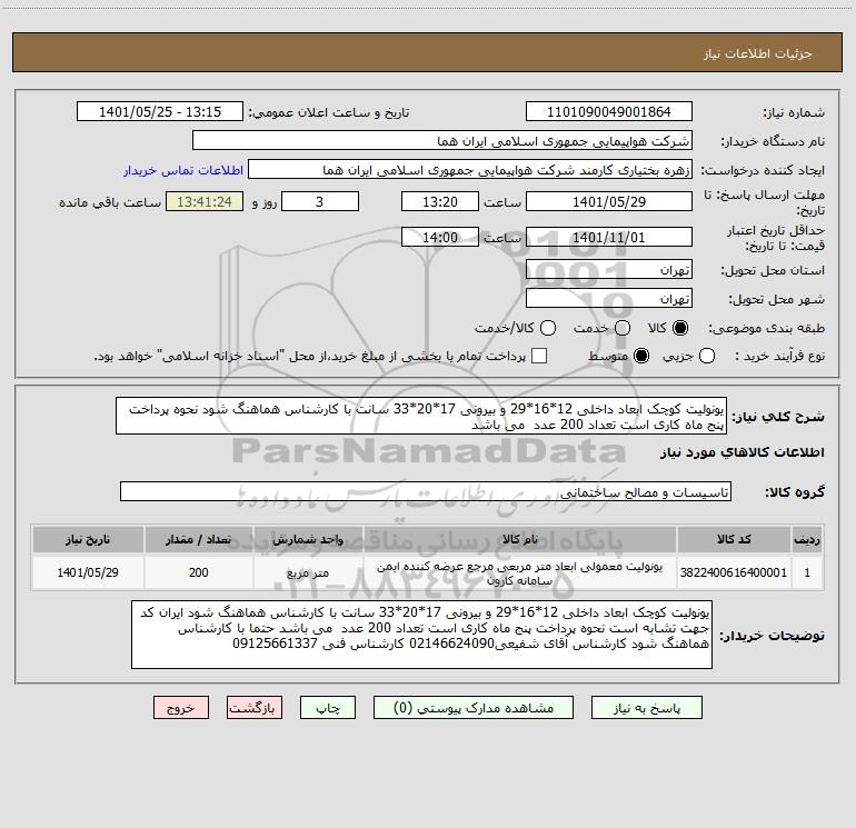 شرح کلی نیاز: یونولیت کوچک ابعاد داخلی 12*16*29 و بیرونی 17*20*33 سانت با کارشناس هماهنگ شود نحوه پرداخت پنج ماه کاری است تعداد 200 عدد می باشد