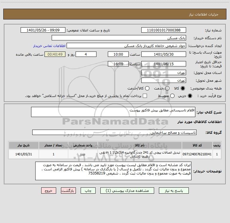 استعلام اقلام تاسیساتی مطابق پیش فاکتور پیوست, استعلام اقلام تاسیساتی مطابق پیش فاکتور پیوست