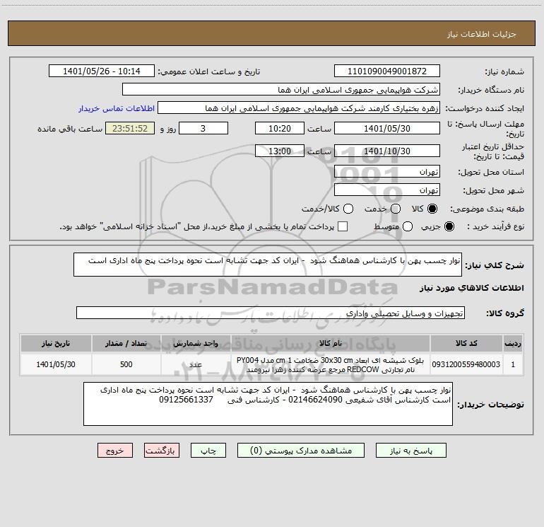 شرح کلی نیاز: نوار چسب پهن با کارشناس هماهنگ شود - ایران کد جهت تشابه است نحوه پرداخت پنج ماه اداری است