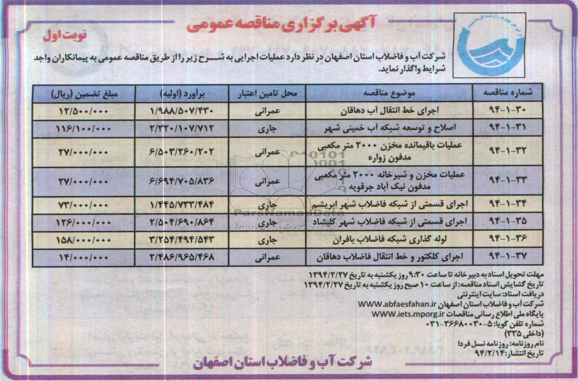 شرکت آب و فاضلاب استان اصفهان در نظر دارد عملیات اجرایی به شرح زیر را از طریق مناقصه عمومی به پیمانکاران واجد شرایط واگذار نماید:
