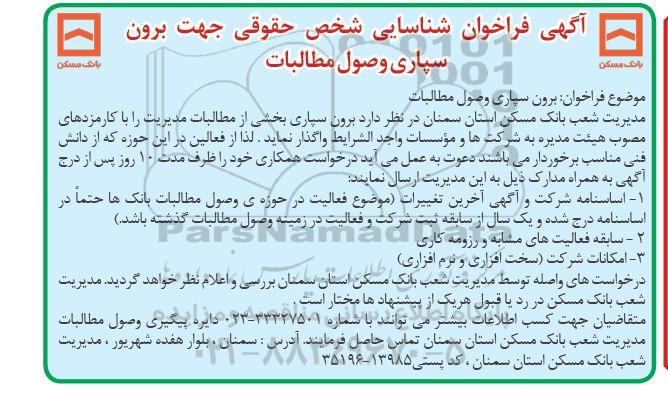 مدیریت شعب بانک مسکن استان سمنان در نظر دارد برون سپاری بخشی از مطالبات مدیریت را با کارمزدهای مصوب هیت مدیره به شرکتها و موسسات واجد شرایط واگذار نماید. لذا از فعالین در این حوزه که از دانش فنی مناسب برخوردار می باشند دعوت به عمل می آید درخواست همکاری خود را ظرف مدت 10 روز پس از درج اگهی به همراه مدارک ذیل به این مدیریت ارسال نمایند
