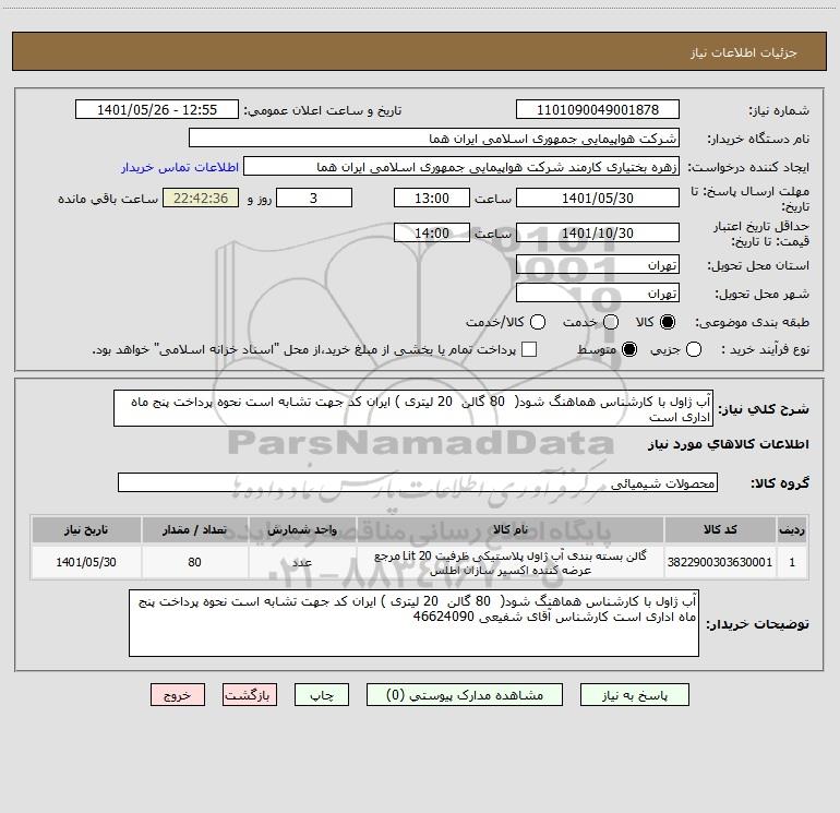 شرح کلی نیاز: آب ژاول با کارشناس هماهنگ شود( 80 گالن 20 لیتری ) ایران کد جهت تشابه است نحوه پرداخت پنج ماه اداری است