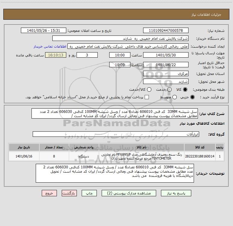 توضیحات خریدار:سل شیشه 33MM کد فنی 606010 تعداد6 عدد / وسل شیشه 100MM کدفنی 606030 تعداد 2 عدد مطابق مشخصات پیوست پیشنهاد فنی ومالی ارسال گردد/ ایران کد مشابه است / تحویل درپالایشگاه با هزینه فروشنده می باشد