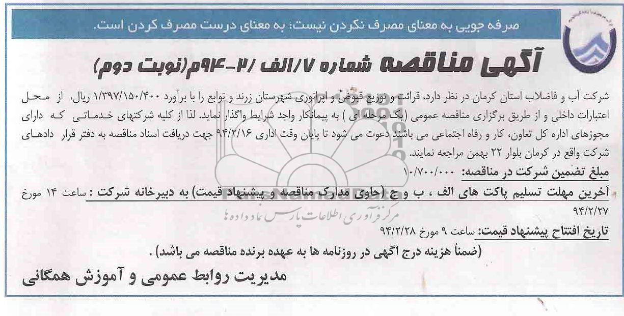 . لذا از کلیه شرکتهای خدماتی که دارای مجوز از مراجع ذیصلاح می باشند دعوت می شود ضمن ارائه مجوز تا پایان وقت اداری 94.2.16 جهت دریافت اسناد مناقصه به آدرس : کرمان - انتهای بلوار 22 بهمن - شرکت آب و فاضلاب استان مراجعه نمایند.