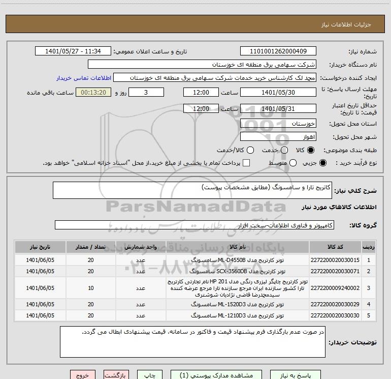 شرح کلی نیاز: کاتریج تارا و سامسونگ (مطابق مشخصات پیوست)