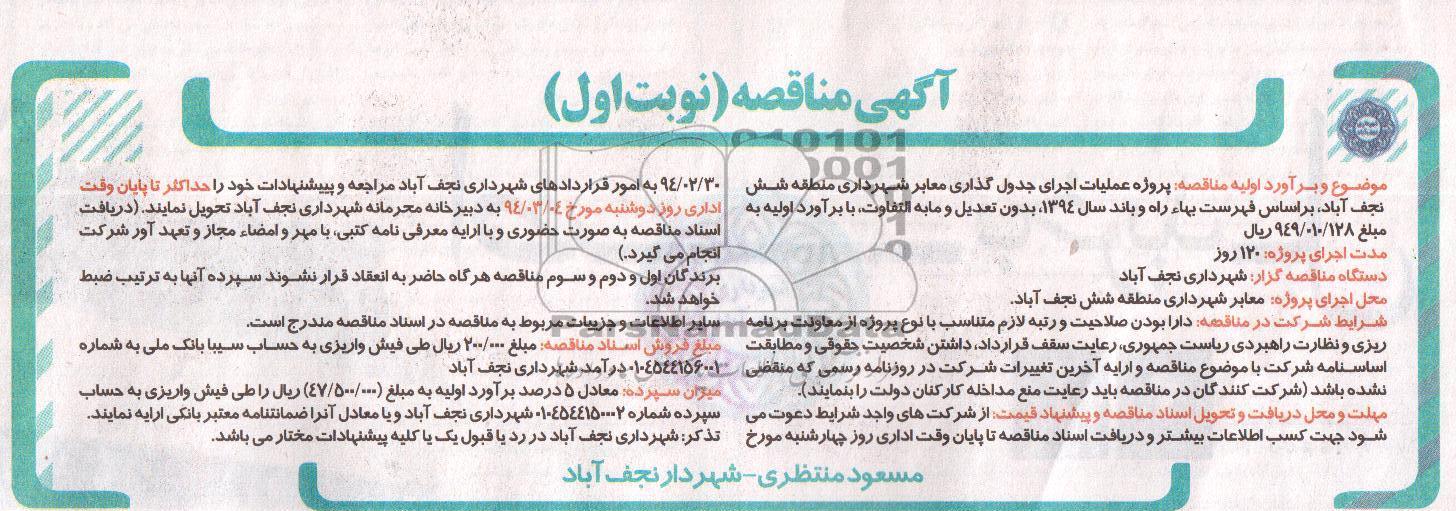 موضوع و برآورد اولیه مناقصه: پروژه عملیات اجرای جدول گذاری معابر شهرداری منطقه شش نجف آباد، براساس فهرست بهاء راه و باند سال 1394، بدون تعدیل و مابه التفاوت، با برآورد اولیه به مبلغ 949.010.128 ریال