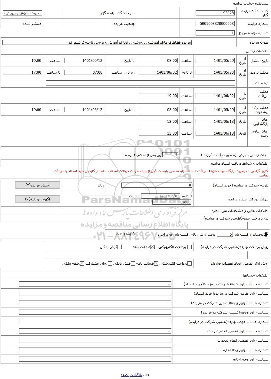 | شماره مورد اجاره | 5101093328000083 | نوع برگزاری مزایده | مزایده عمومی | |