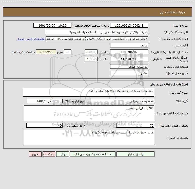 شرح کلی نیاز: روغن مطابق با شرح پیوست - کالا باید ایرانی باشد