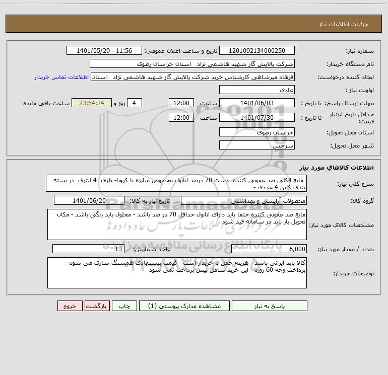 نام دستگاه خریدار:شرکت پالایش گاز شهید هاشمی نژاد استان خراسان رضوی