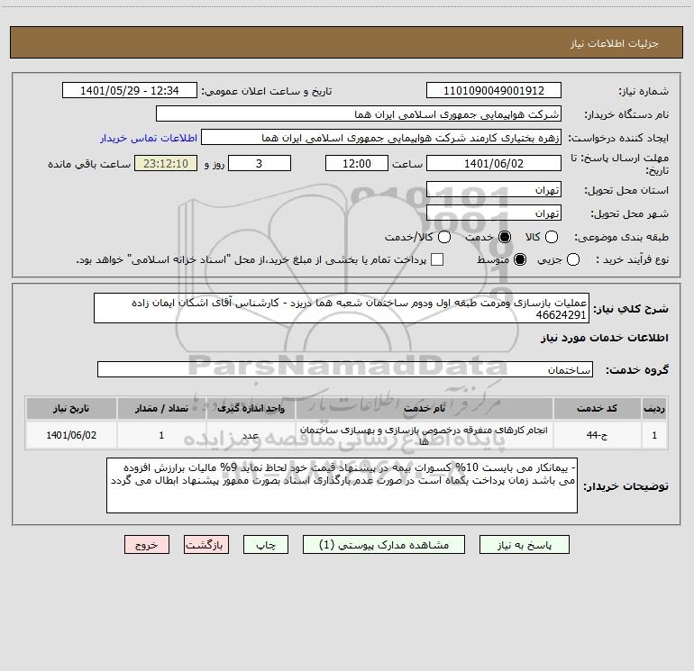 شرح کلی نیاز: عملیات بازسازی ومرمت طبقه اول ودوم ساختمان شعبه هما دریزد - کارشناس آقای اشکان ایمان زاده 46624291