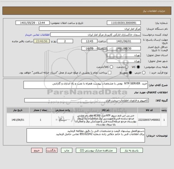 | 1 | 2223200571450002 | جی پی اس تایم سرور NTP مدل AF300 فاقد نام تجارتی مرجع سازنده فنی و مهندسی برق و مخابرات پایا نیروی بهارستان مرجع عرضه کننده فنی و مهندسی برق و مخابرات پایا نیروی بهارستان | دستگاه | 1 | 1401/06/01 |