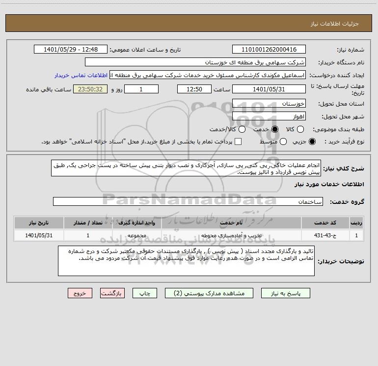 شرح کلی نیاز: انجام عملیات خاکی, پی کنی, پی سازی, آجرکاری و نصب دیوار بتنی پیش ساخته در پست جراحی یک, طبق پیش نویس قرارداد و آنالیز پیوست.